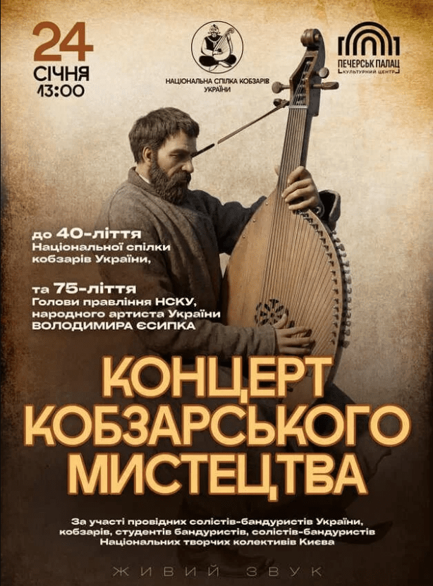 Національна спілка кобзарів України святкує 40-річчя особливим концертом. Глядачі почують весь спектр кобзарського та бандурного мистецтва — від традиційного до сучасного. На сцені виступлять виконавці на лірі, кобзі, старосвітській та панській бандурі.