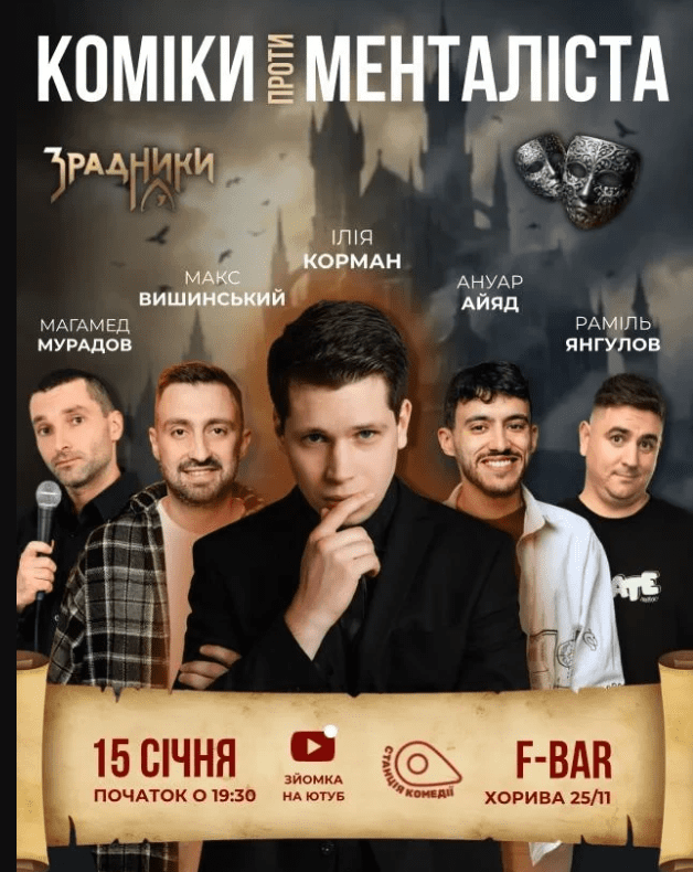 15 січня о 19:30 у F-Bar відбудеться шоу “Коміки проти”. Магамед Мурадов, Раміль Янгулов та Ануар Айяд розбиратимуть стереотипи та міфи.
