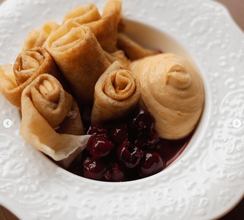 Ресторан авторської європейської кухні Mon Park приготував справжню шоу-страву — пшеничні млинці в соусі з карамелі, вершкового масла та апельсинового фрешу. Їх поливають лікером куантро і підпалюють прямо перед гостями. Подають з морозивом та фісташками.