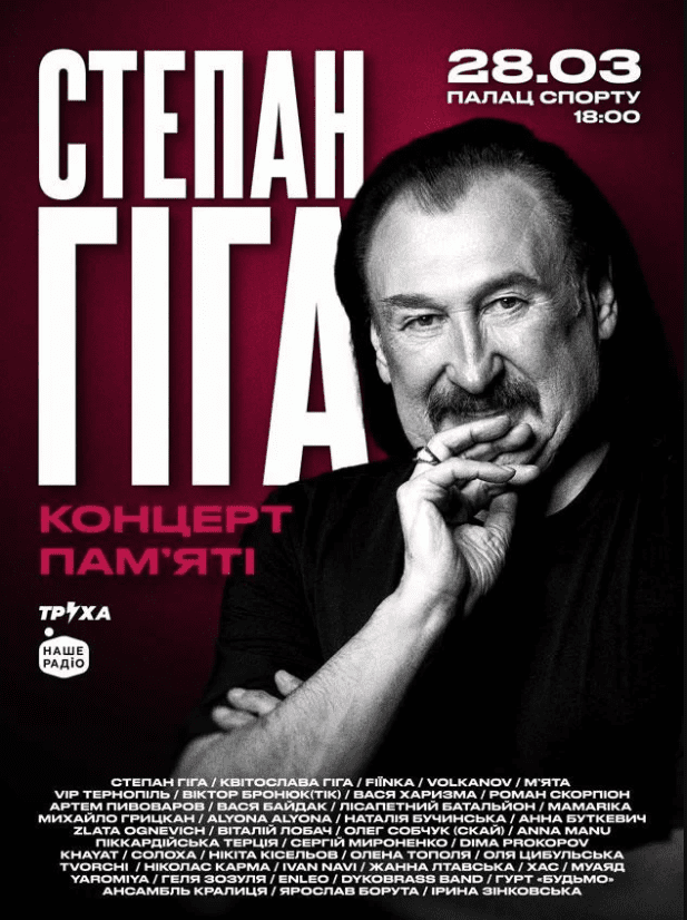 У грудні минулого року Україна втратила Степана Гігу — людину, без пісень якої складно уявити цілі покоління. Цього вечора в Палаці спорту (пл. Спортивна, 1) о 18:00 найкращі українські артисти виконають його композиції — «Яворина», «Цей сон», «Друзі мої», «Золото Карпат» та інші.