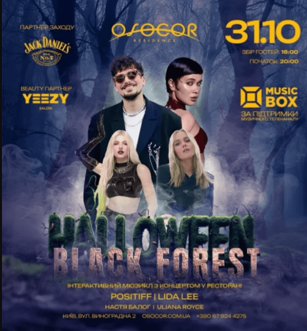 OSOCOR Residence (вул. Виноградна, 2) проводить масштабну інтерактивну вечірку «Halloween: Black Forest» сьогодні о 18:00. У програмі — перформанси, шоу та темна лісова атмосфера.
