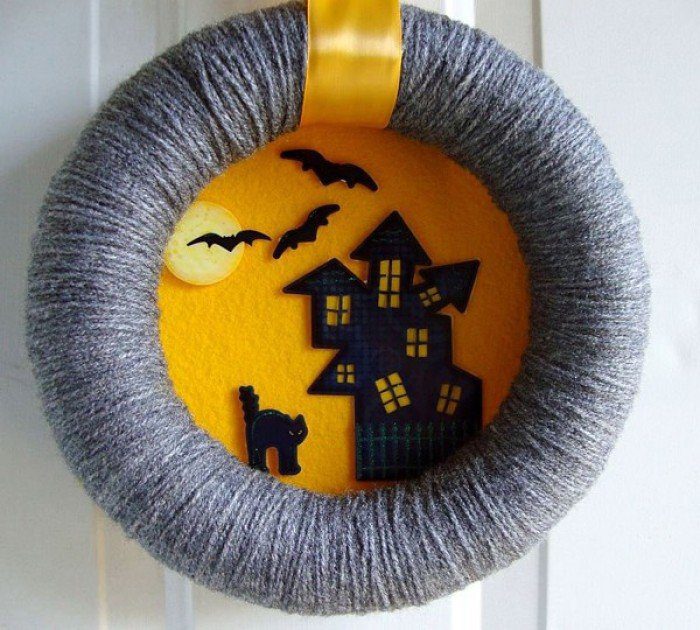Візьміть основу з гілок або купіть готову форму з пінопласту в магазині для творчості. Обмотайте її чорною або помаранчевою стрічкою — це буде основа. Приклейте декоративні елементи: штучні квіти, черепи, кажанів, павуків. Додайте ланцюги або підвісьте маленькі гарбузики для завершеності композиції.