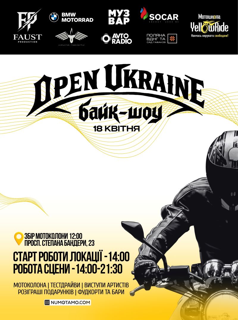 О 14:00 на поляні ВДНГ (просп. Академіка Глушкова, 1) стартує Open Ukraine — міжнародний байк-фестиваль. Усе починається ще раніше: о 12:00 учасники збираються на старті, о 12:30 — стант-шоу, о 13:15 — масштабна мотоколона вирушає містом і о 14:00 прибуває на ВДНГ. Далі до 21:30 — концертна програма за участі LADA, PRIANA, AMBERWHALE, KAROOKA, «Різна», THE ARMO, MARSHA та гурту «Мій конфлікт».