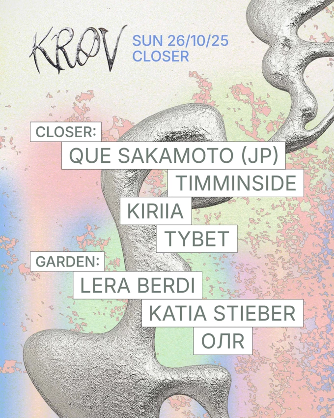 Електронний музикант із Токіо Que Sakamoto привезе в Closer сет із disco, garage та breakbeat. Разом із ним виступлять Timminside, Kiriia, Tybet, а в саду сцену займуть Lera Berdi, Katia Stieber та «ОЛR». Військові проходять безплатно.